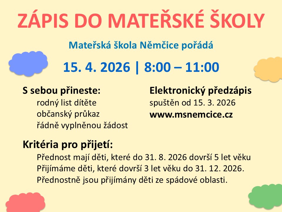 ZÁPIS DO MATEŘSKÉ ŠKOLY NĚMČICE